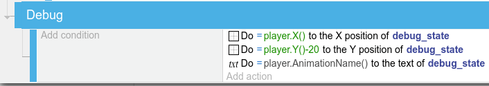 In order to know in which state the player currently is during gameplay, create a text object and call it “debug_state”. Add it to the main scene and create the actions as below (with an empty condition), in order to display the current player state right above its head. Whenever something doesn't function the way it should, we will know which state we have to investigate to find the error.