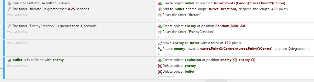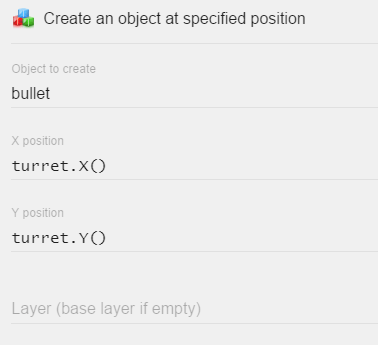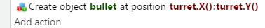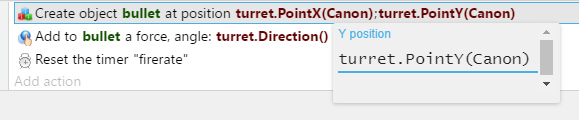 The only thing is left to do is to tell GDevelop to fire the bullets from the "Canon" point of the "turret" object. So in our "create bullet" action, we need to change turret.X() and turret.Y() expressions, to turret.PointX("Canon") and turret.PointY("Canon"). We can change them by clicking the expressions inside the editor.