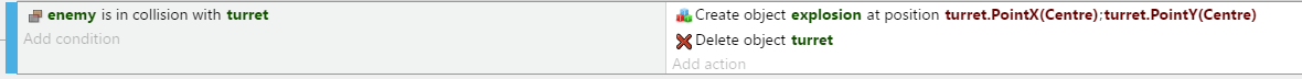 Finally, instead of creating the "explosion" object at the "Origin" point of the "enemy", it is necessary to create the object at the Centre Point. Change the expression in the create explosion action from enemy.X() to enemy.PointX("Centre") and from enemy.Y() to enemy.PointY("Centre")